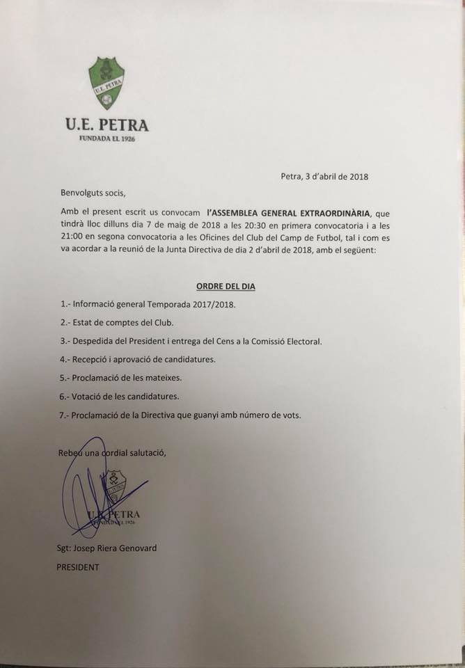 Benvolguts socis. Enguany és any d’eleccions a la Junta Directiva del nostre club i és per això que publicam la convocatòria d’Assemblea General Extraordinària per dur-les a terme. Serà dilluns dia 7 de maig al Camp de Futbol a les 20:30 en primera convocatòria i a les 21:00 en segona convocatòria. L’ordre del dia estarà penjat al tauló d’anuncis del camp de futbol, a la web del club i al tauló d’anuncis de les Oficines Municipals de l’Ajuntament de Petra. A l’Ajuntament també hi haurà exposat el cens d’electors.